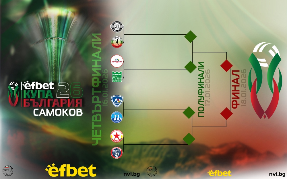 Схемата на efbet Купа България 2026 вече е ясна, а финалната фаза на турнира ще се проведе в зала “СамЕлион” в гр. Самоков, където най-добрите отбори ще се изправят в директни елиминации за трофея.